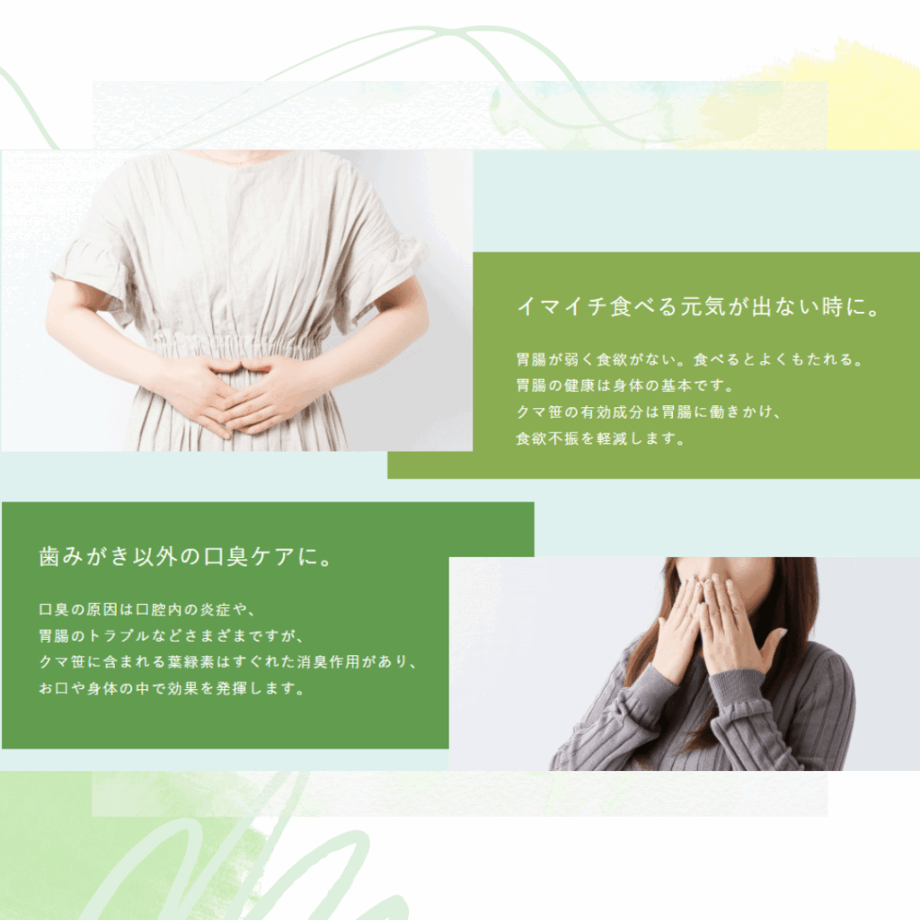口臭の原因は口腔内の炎症や、胃腸のトラブルなどさまざまですが、クマ笹に含まれる葉緑素はすぐれた消臭作用があり、お口や身体の中で効果を発揮します。