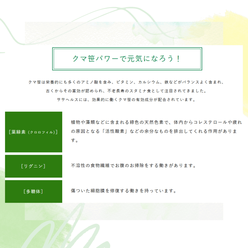 ササヘルスには、効果的に働くクマ笹の有効成分が配合されています。