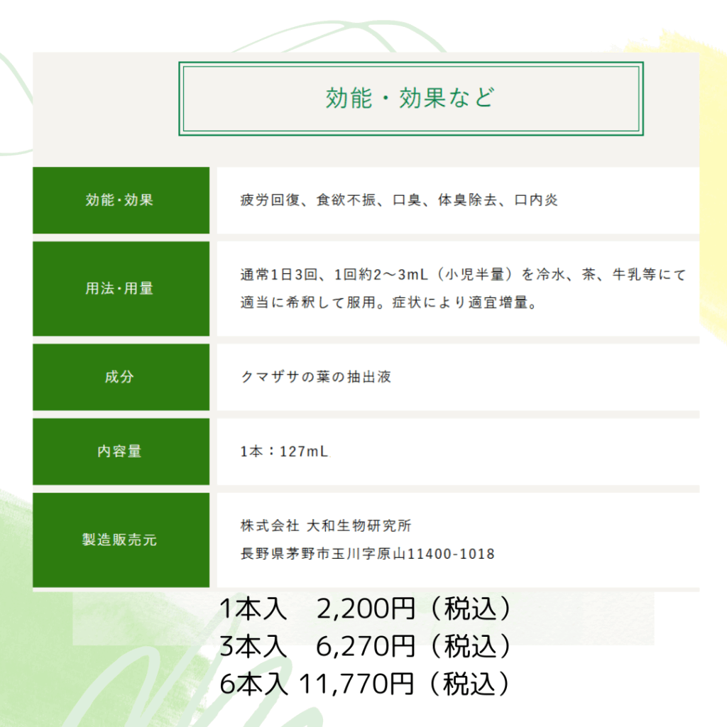 原因はいろいろですが、身体全体から治すことが大切です。クマ笹の有効成分は、内服することで体臭に効果をあらわします。